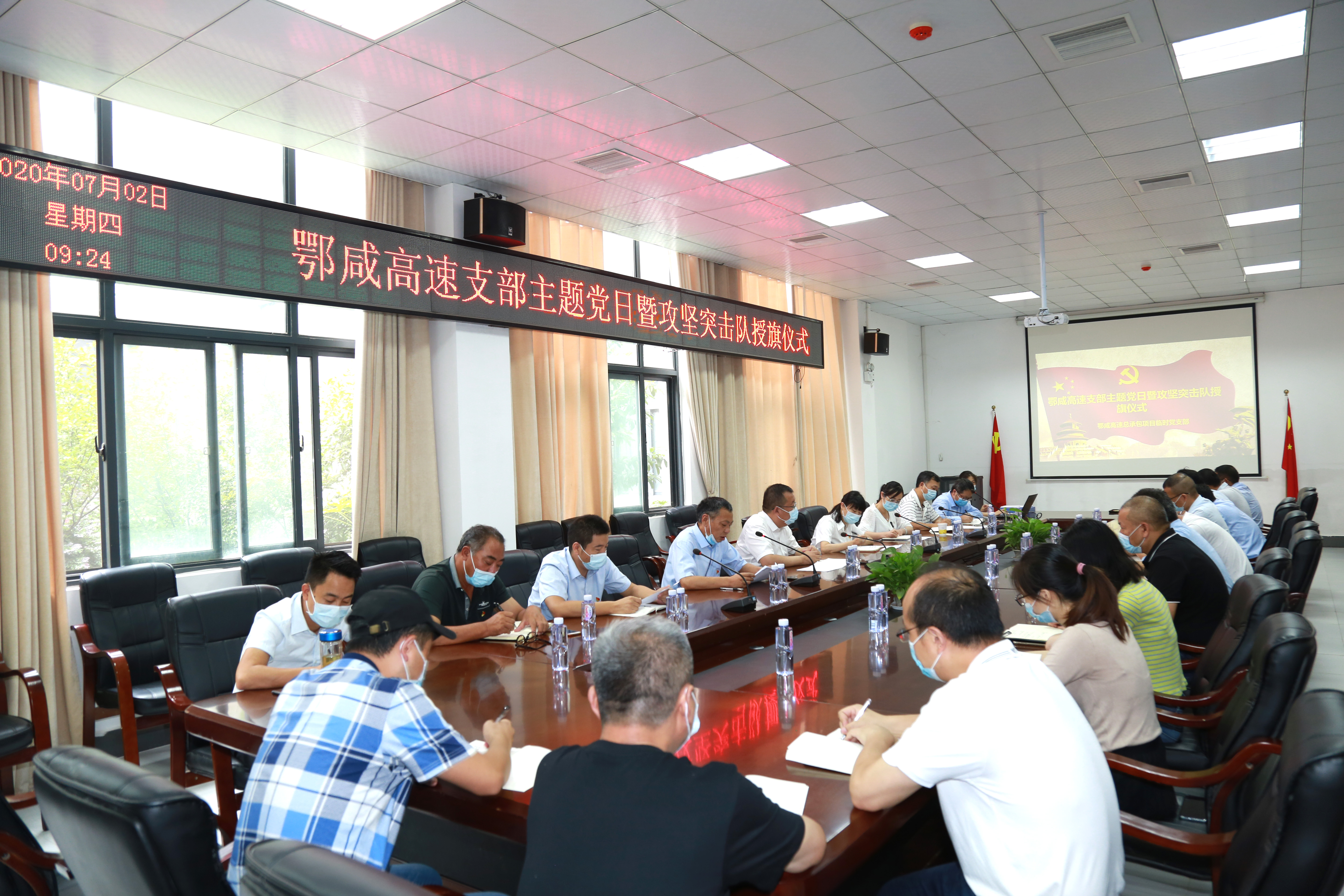 7月2日上午,湖北路橋鄂咸項目臨時黨支部組織開展慶“七一”主題黨日活動暨攻堅突擊隊授旗儀式,隆重慶祝建黨99周年,動員項目全體黨員干部進一步凝心聚力、銳意進取、積極投身到鄂咸項目建設之中。項目臨時黨支部32名黨員在主會場參加,各攻堅突擊隊非黨員隊員通過視頻形式參加會議。