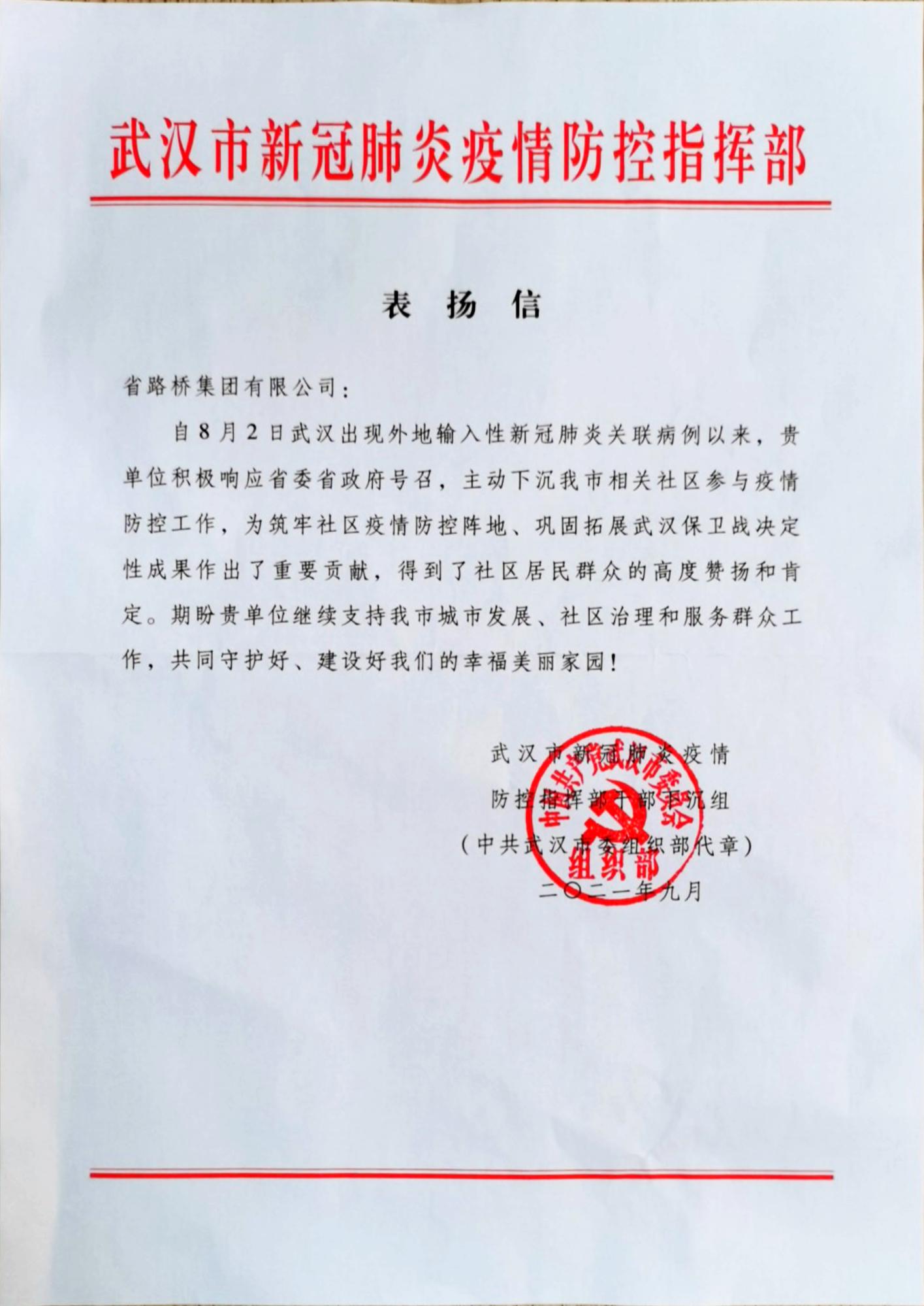 “感謝你們在新冠疫情反撲的關(guān)鍵時(shí)期,為我們送來疫情防護(hù)物資和防暑慰問品。感謝你們主動伸出援手,對社區(qū)門亭升級改造、安排黨員積極下沉,為鞏固武漢保衛(wèi)戰(zhàn)作出重要貢獻(xiàn)!”新五里社區(qū)祈斌書記一邊激動地連聲道謝,一邊親手將武漢市委組織部和武漢防控指揮部聯(lián)名頒發(fā)的“表揚(yáng)信”遞到公司黨群部部長手里。