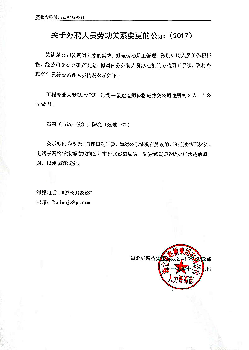 關于外聘人員勞動關系變更的公示(2017)