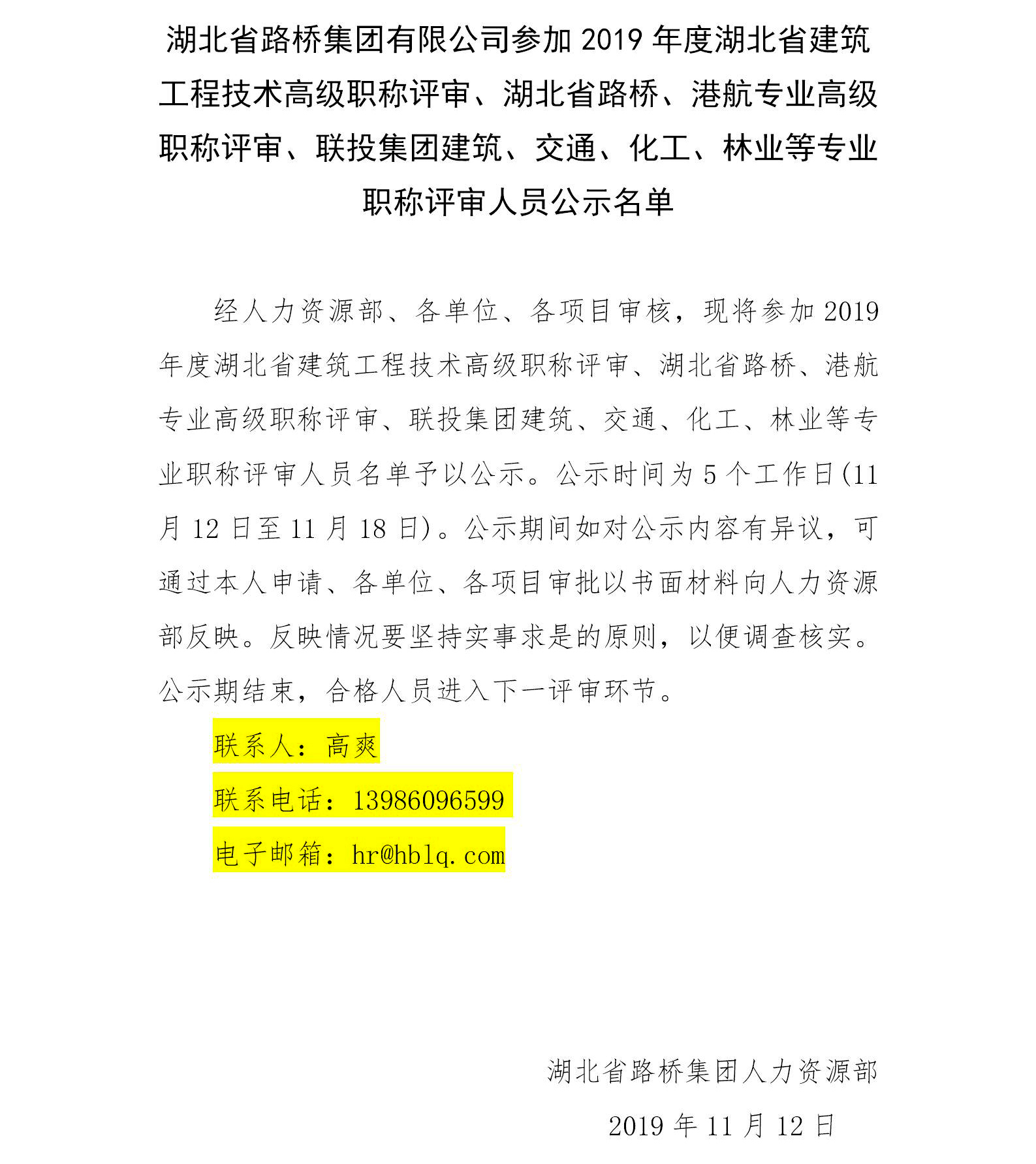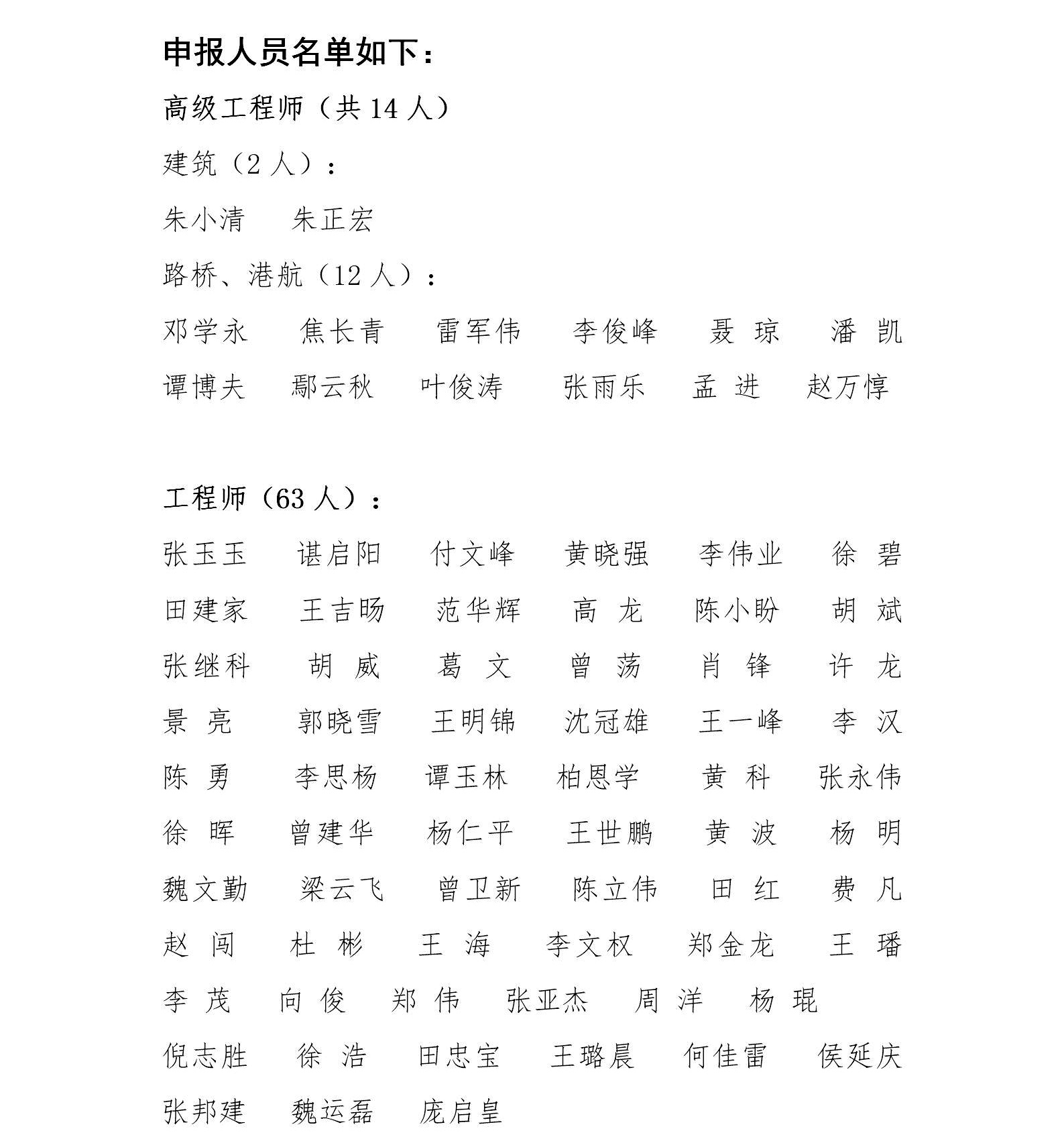 湖北省路橋集團有限公司參加2019年度湖北省建筑工程技術高級職稱評審、湖北省路橋、港航專業(yè)高級職稱評審、聯(lián)投集團建筑、交通、化工、林業(yè)等專業(yè)職稱評審人員公示名單