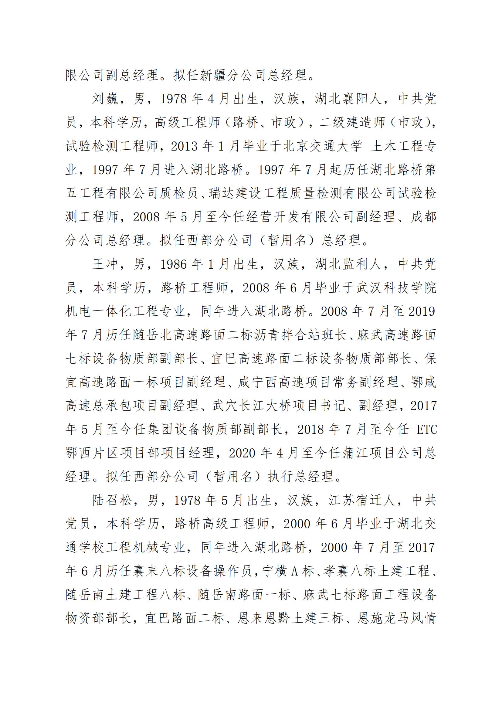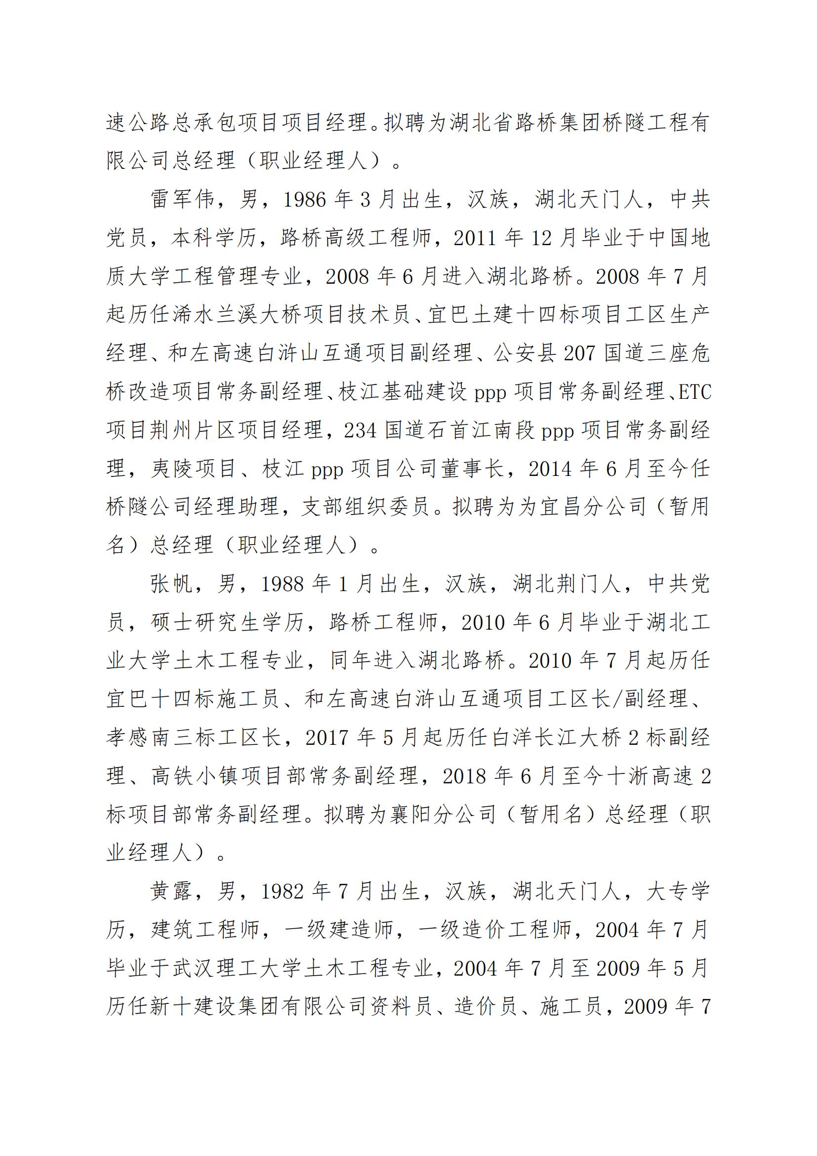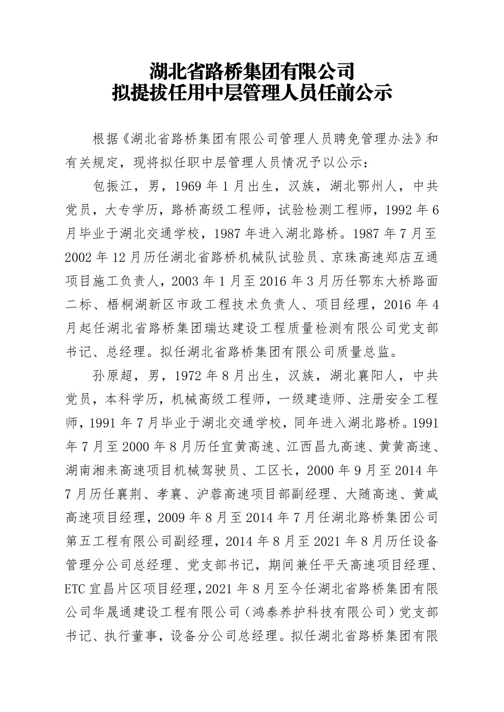 湖北省路橋集團有限公司擬提拔任用中層管理人員任前公示