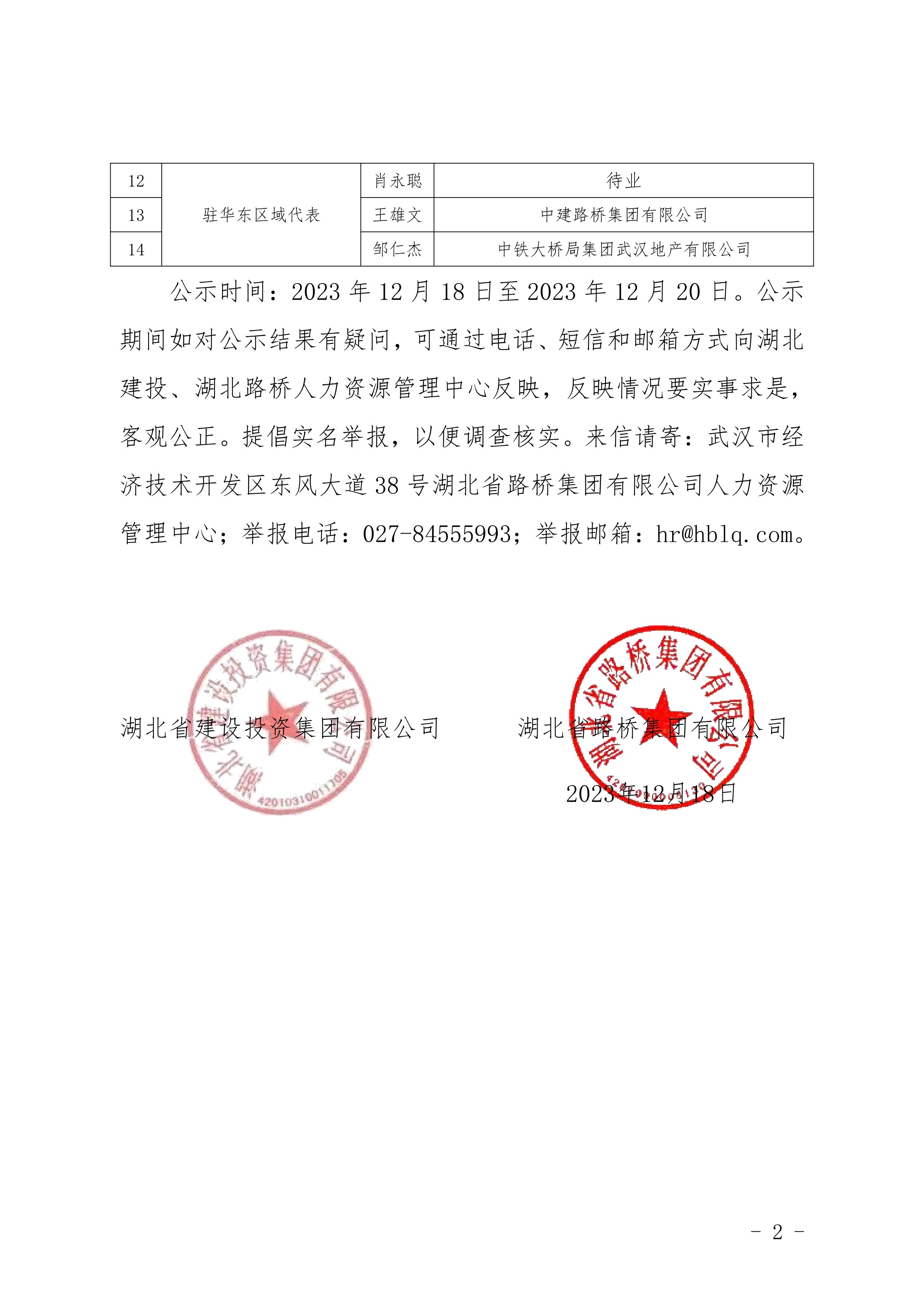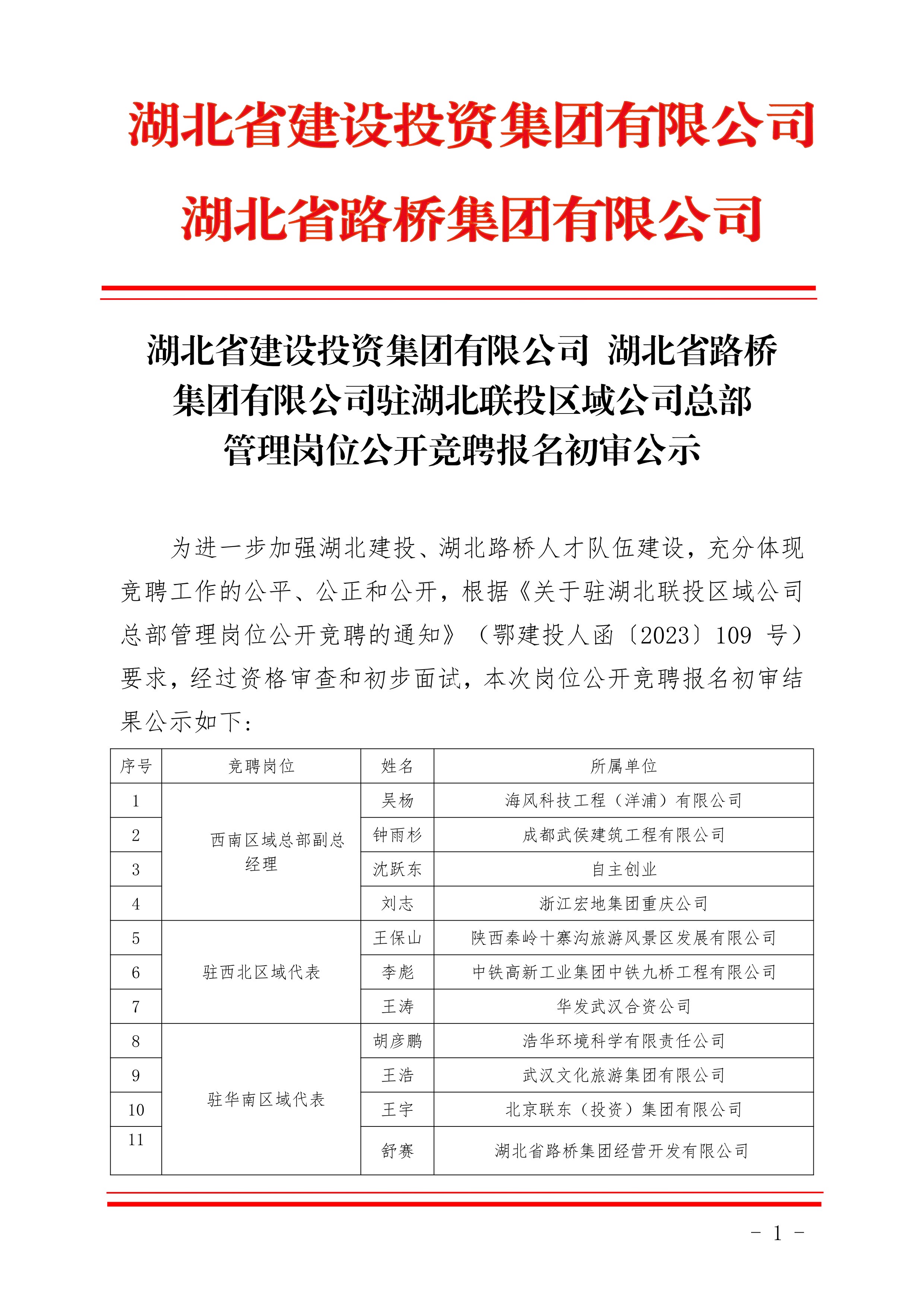 湖北省建設投資集團有限公司、湖北省路橋集團有限公司駐湖北聯投區域公司總部管理崗位公開競聘報名初審公示