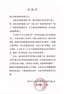 近日,湖北路橋高新八路一期品質提升及改擴建工程項目部收到鄂州市梁子湖區交通運輸局、鄂州市公安局交通管理局梁子湖大隊的感謝信及表揚信,對高新八路一期項目保質保量完成建設任務,如期實現全線貫通給予高度肯定。