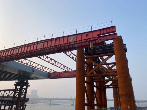 依托丹江口市水都二橋工程,提出了小曲率豎曲線長距離鋼箱梁分段多輪次頂推技術,研發了大跨徑裝配式鋼導梁結構,研制了具有縱橫向糾偏功能的鋼箱梁頂推滑移設備,實現分區多點施工及鋼箱梁縱橫向位置的精準調節,保證了導梁的安裝質量,提高了導梁的周轉效率及鋼箱梁的頂推滑移精度,降低了施工成本及施工風險,節能減排效益突出。