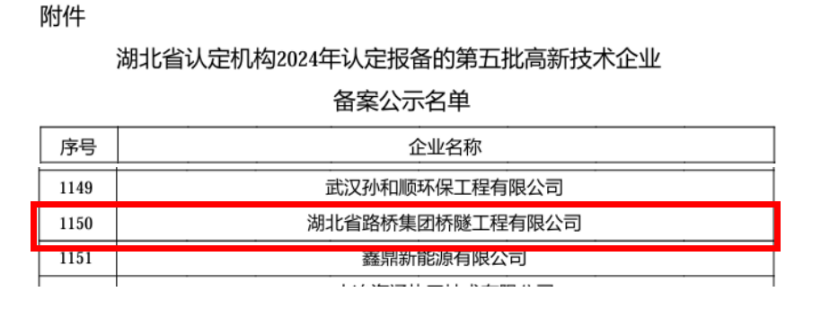 1月15日,全國高新技術企業認定管理工作領導小組辦公室發布了湖北省2024年第五批國家高新技術企業的備案名單,聯投湖北路橋橋隧公司通過認定,正式邁入國家高新技術企業行列。這標志著橋隧公司在科技創新發展道路上取得新的里程碑,開啟企業發展的新篇章。